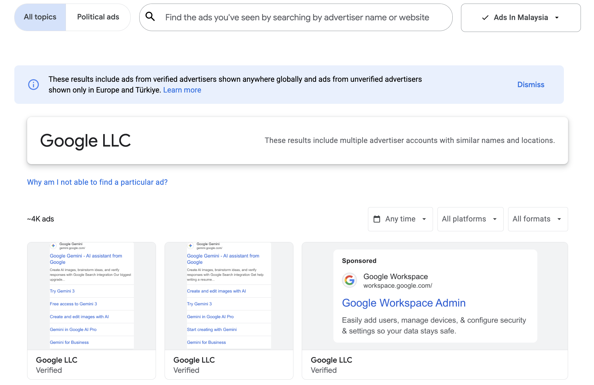 Google provides a free tool called the Ads Transparency Center. This tool was built to help people see who is paying for ads, but smart business owners use it to see what their competitor are doing.