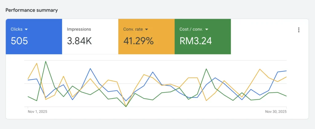 1.11K clicks drove WhatsApp leads, costing only RM32.98 per confirmed closed sale.