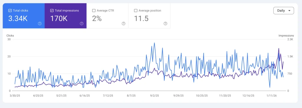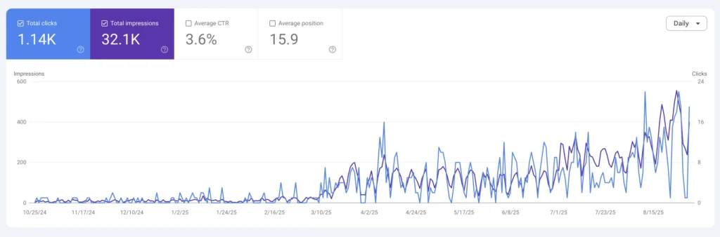 Built consistent organic momentum for a B2B client, securing 32,000 impressions and steady month-over-month traffic growth from zero.