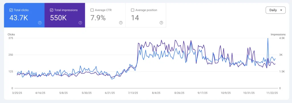 Scaled a global content platform to 43,700 organic clicks and half a million impressions, achieving an exceptional 7.9% Click-Through Rate.”
