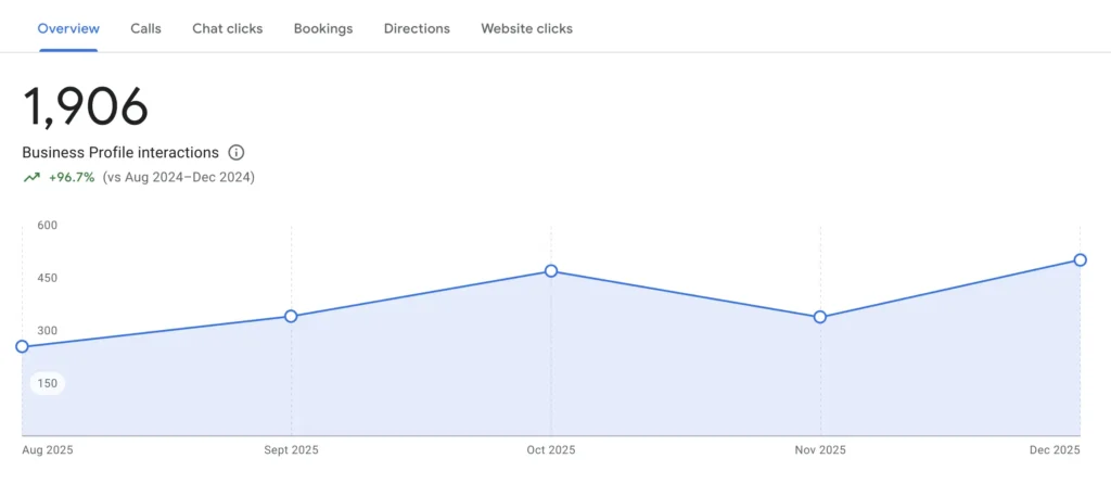 Optimized local presence to achieve a 96.7% increase in engagement, driving 1,906 customer interactions (calls and direction requests) in just 5 months.”